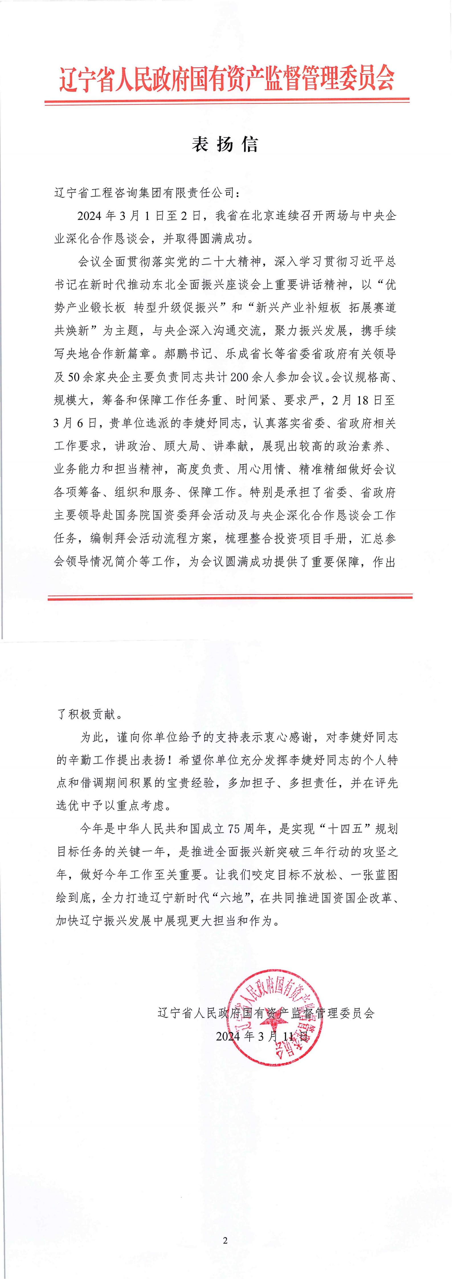 近日,公司收到省國資委發(fā)來的表揚信,對我單位李婕妤同志在北京召開的“遼寧省與中央企業(yè)深化合作懇談會”上的辛勤工作提出表揚。這是李婕妤同志繼2023年6月25日參與籌備“深化東北地區(qū)國資國企改革現(xiàn)場推進會”“國資央企助力東北全面振興座談會”后第二次受到省國資委表揚。
