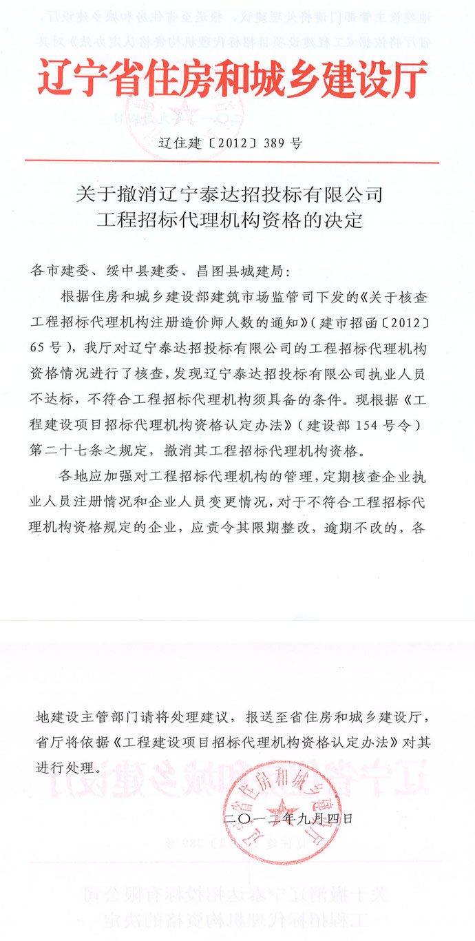 【概要描述】關(guān)于撤銷遼寧泰達(dá)招投標(biāo)有限公司工程招標(biāo)代理機(jī)構(gòu)資格的決定