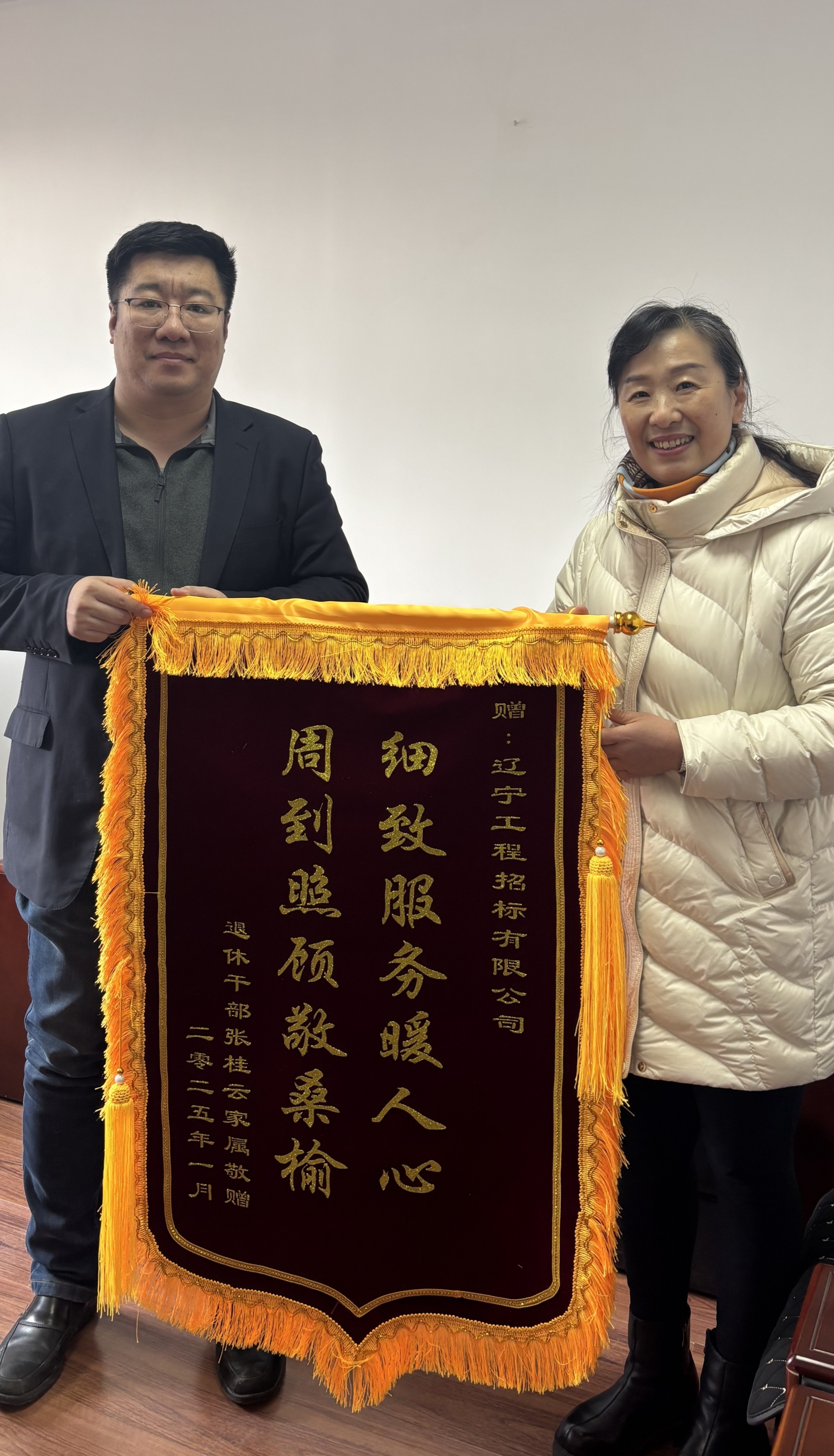 “多年來,你們始終如一對(duì)退休老同志給予無微不至的關(guān)心和關(guān)愛,及時(shí)了解和幫助我們解決遇到的問題和困難!”16日下午,原成套局退休老干部張桂云女兒來到公司,把寫有細(xì)致服務(wù)暖人心、周到照顧敬桑榆”的錦旗送到公司有關(guān)領(lǐng)導(dǎo)手中,真誠(chéng)感謝公司多年來的關(guān)心幫助,同時(shí)對(duì)公司近年來取得的成績(jī)感到高興,并表示將會(huì)繼續(xù)關(guān)注公司發(fā)展,也祝愿遼寧工程招標(biāo)有限公司事業(yè)邁上新臺(tái)階。